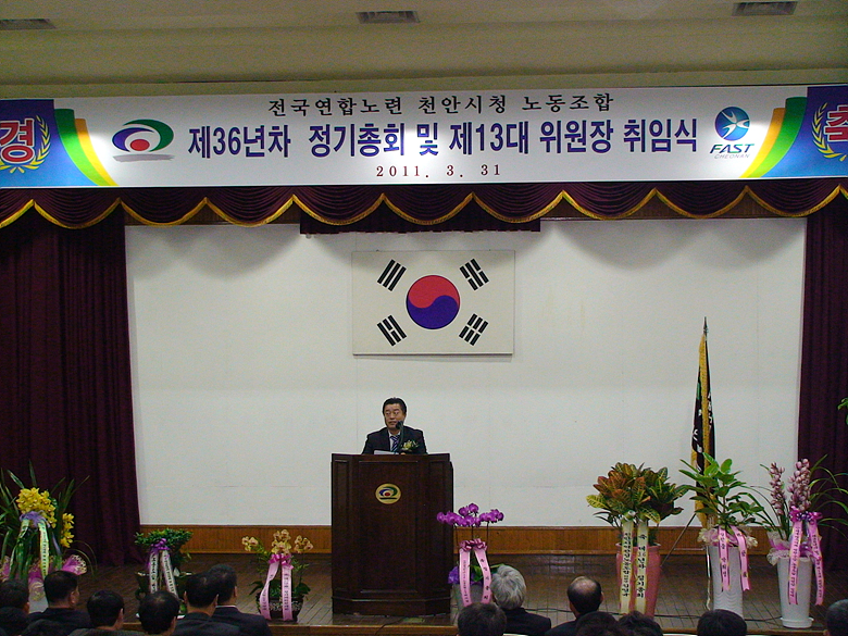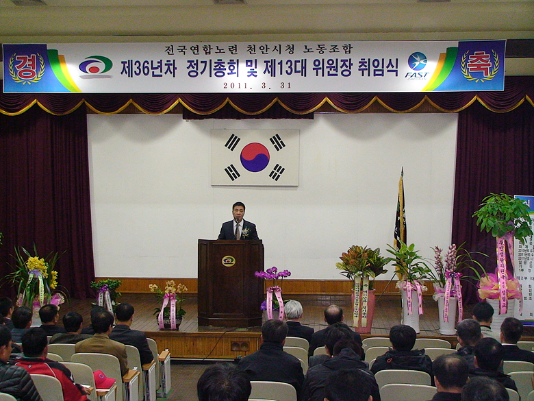 2011³â 3¿ù 31ÀÏ °³ÃÖµÈ Á¦36³âÂ÷ õ¾È½Ãû³ëµ¿Á¶ÇÕ Á¤±âÃÑȸ ¹× Á¦13´ë À§¿øÀå ÃëÀÓ½Ä Çà»çÀÔ´Ï´Ù.